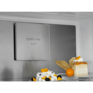 Hladilnik s kroženjem zraka v vsakem kotičku s Cooling 360°. Optimalno razporejene prezračevalne odprtine zagotavljajo hlajenje v vsakem kotičku. Hrbtna stran iz nerjavnega jekla prispeva k dizajnu in funkcionalnosti, saj pripomore k hitri obnovitvi temperature po odpiranju vrat. Živila ostanejo hrustljava in ohranijo naravne okuse.