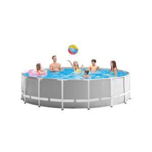 Intex bazen Prism Frame, 457 × 122 cm, s filter kartušo, z lestvijo, 26726NP zagotovljena osvežitev v vročih poletnih dneh in zabava za celo družino. Intex prism frame s premerom 457 cm in višino 122 cm ponuja masivno konstrukcijo in dolgo življenjsko dobo. Dno in stena sta izdelana iz 3 plasti PVC.