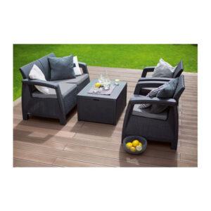 Corfu II Box je elegantna vrtna garnitura s teksturo, ki posnema ratan, sestavljena iz dveh stolov, klopice za dva in mize, ki deluje tudi kot prostoren zaboj za shranjevanje blazin.