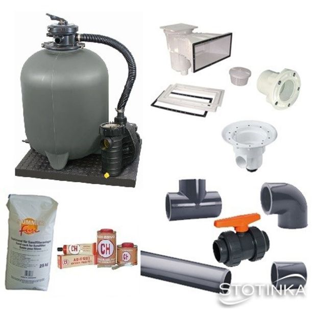 Bazenski komplet vključuje vse potrebno za postavitev popolnoma funkcionalnega bazena in sicer: stiroporne zidake; montažno folijo debeline 0,75 mm; kaširani antibakterijski filc; aluminijaste kotnike za pritrditev folije; INOX lestev; peščeni filter set Aqua Technik 11m3/h; vgradne elemente bazenske instalacije s samoreznimi vijaki (1 x talni odtok Aqualux Vitalia, 2 x skimer Aqualux Vitalia, 4 x povratna šoba Aqualux Vitalia); ves potreben cevni ter spojni material.