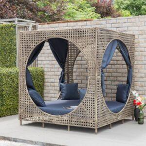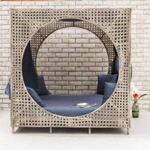 Dnevna postelja nudi prijeten način preživljanja časa na svežem zraku in uživanja v dolgih večerih na prostem. V kompletu so mehke in udobne blazine. Na voljo sta dve sedežni blazini in štirje vzglavniki dimenzij 50x50cm. Prevleka blazin je modra olefinska tkanina. Jekleni okvir dnevne postelje je prevlečen s plastičnim protjem.